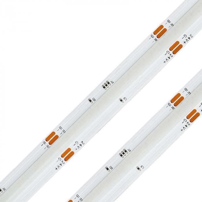 Bandă flexibilă LED COB RGB (multicolor) 840 LED/m 15W 24V IP20 este unul dintre cele mai noi modele de benzi LED disponibile pe piața iluminatului. Este proiectat în principal pentru aplicații în care este necesar să se obțină o linie de lumină uniformă - chiar și atunci când este utilizat într-un profil de aluminiu LED foarte superficial. Modelul prezentat de bandă LED COB este, de asemenea, caracterizat printr-un unghi mai larg de împrăștiere a luminii (180 °) - decât în benzile LED bazate pe diode SMD. Folosind acest model de bandă COB RGB, obținem posibilitatea de a schimba și amesteca 3 culori de bază (R + G + B) folosind driverul LED RGB corespunzător, obținând astfel o întreagă paletă de culori diferite.