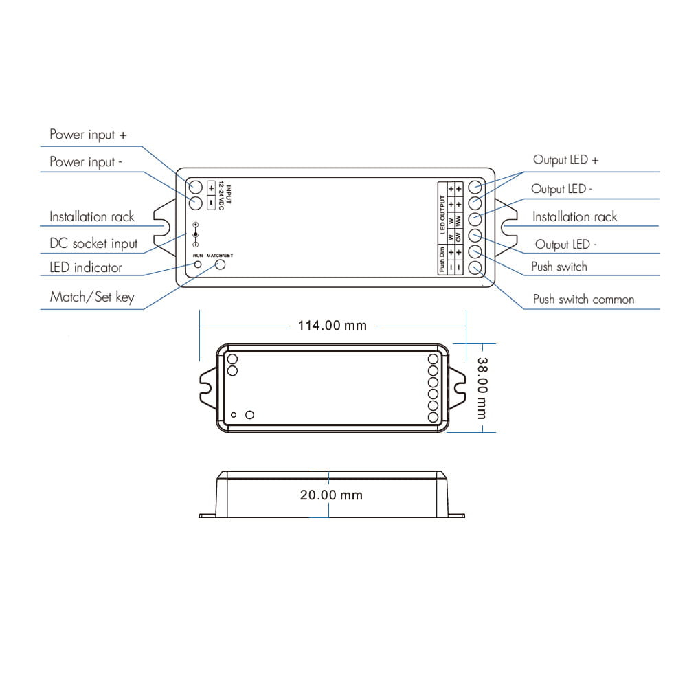 Dimmerul LED WT1 se caracterizează prin posibilitatea de a alege modul de funcționare între instalarea monocromă MONO și CCT cu temperatură de culoare variabilă prin intermediul unui buton mic de pe carcasă, care are și intrări suplimentare. Intrarea de alimentare DC vă permite să furnizați energie direct de la mufa DC și de la intrarea de control dedicată butonului soneriei. Dimmerul LED WT1 are, de asemenea, o serie de protecții în designul său, cum ar fi protecția termică, protecția la scurtcircuit sau protecția conexiunii inverse.
