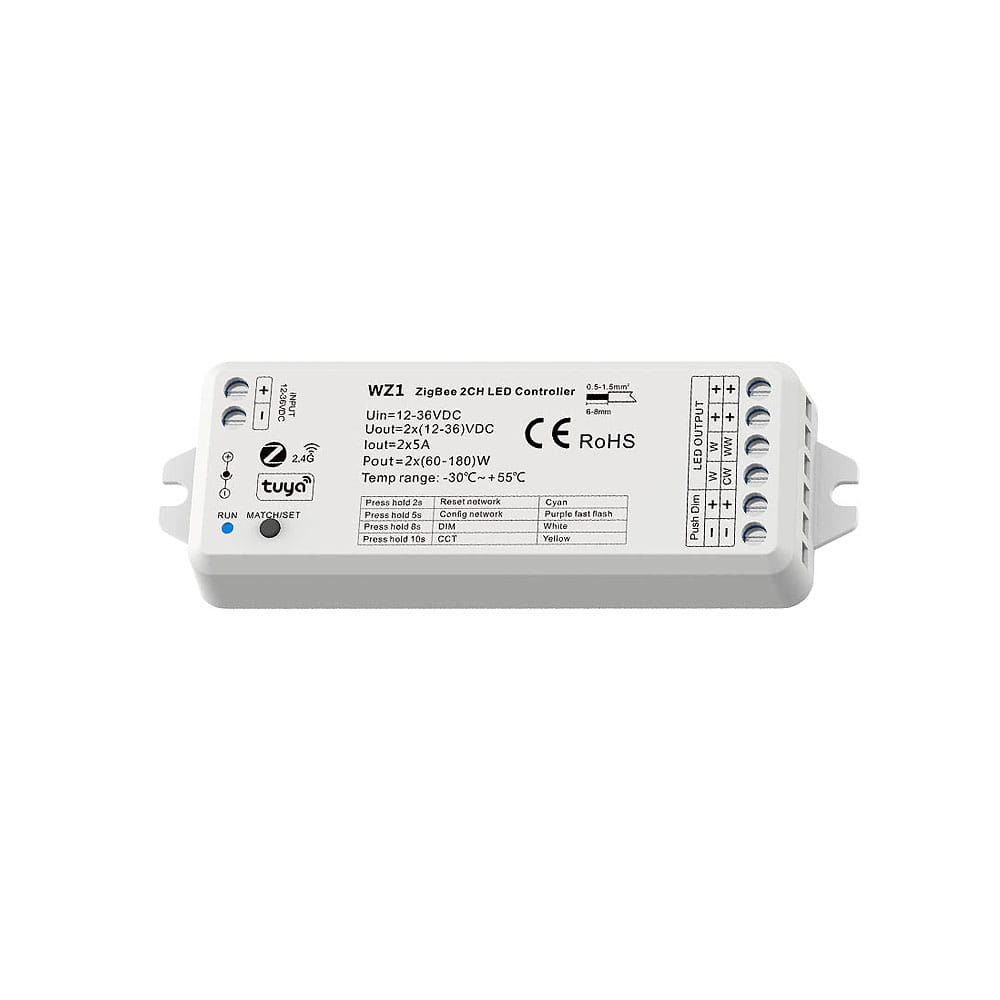 Dimmer LED 2in1 (ZigBee) - Mono /CCT - 12-36V DC 10A - Tuya - WZ1, este un controler LED wireless sub forma unui dimmer LED autonom, care vă permite să controlați iluminarea LED constând din iluminare monocromatică (de exemplu, bandă LED de o singură culoare) sau cu temperatură de culoare CCT variabilă (de exemplu, bandă LED CCT) fără ajutorul dispozitivelor suplimentare. Se caracterizează printr-o gamă largă de tensiune de intrare/ieșire de 12-36V DC și o sarcină de ieșire de 10A. Dimmerul LED WZ1 vă permite să reglați/luminați și să modificați temperatura culorii în intervalul 2700-6500K folosind comunicarea bazată pe protocolul ZigBee. Dimmerul LED WZ1 vă permite, de asemenea, să comunicați cu aplicația Tuya, concepută pentru dispozitivele noastre mobile (de exemplu, smartphone-uri). Calitatea înaltă a manoperei este precedată de o perioadă de garanție de cinci ani.