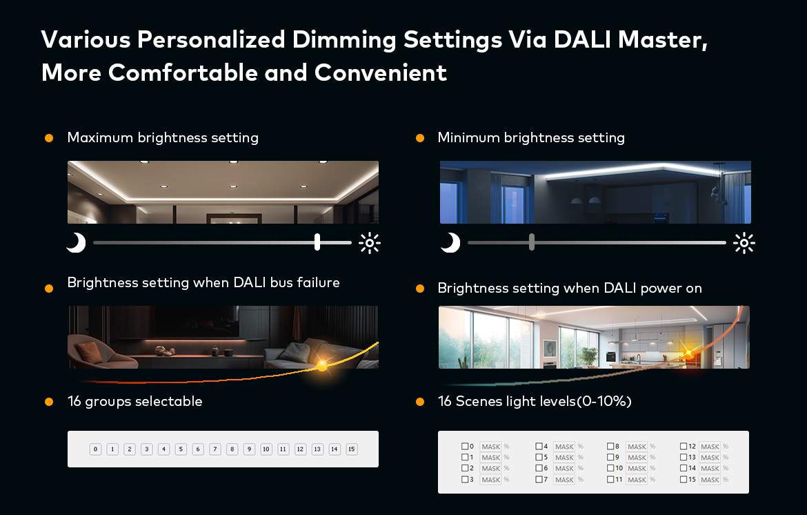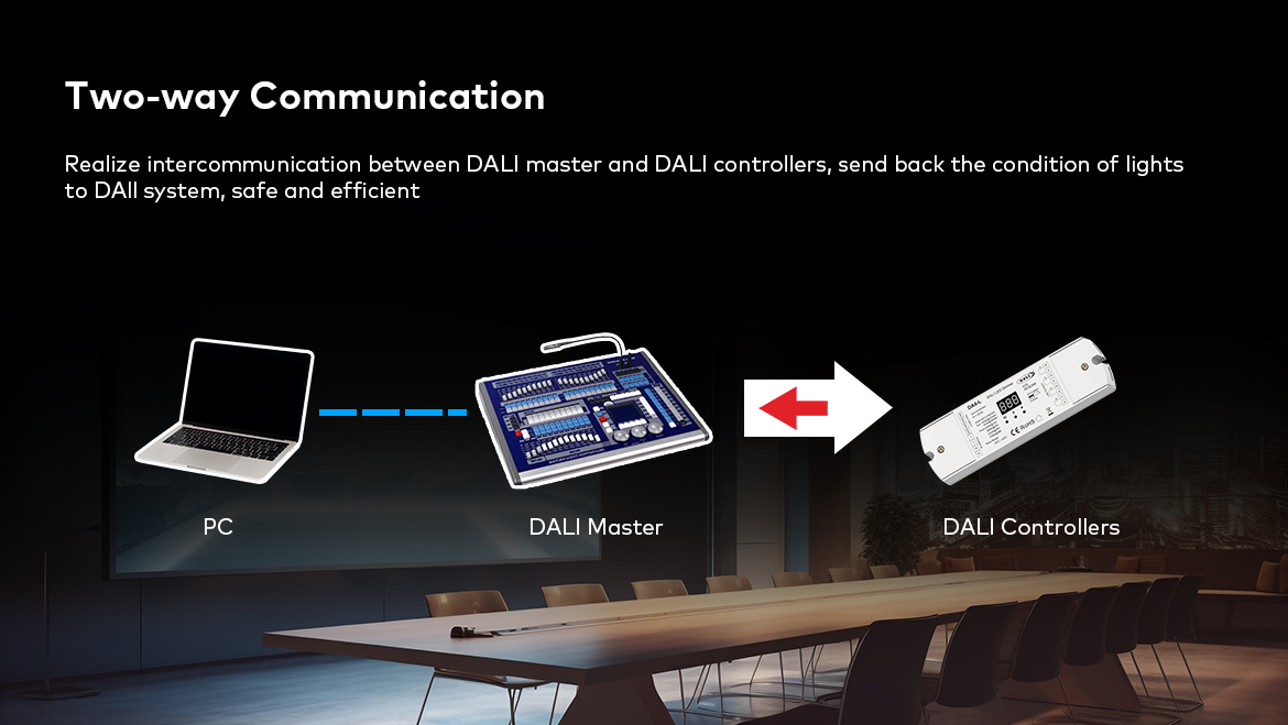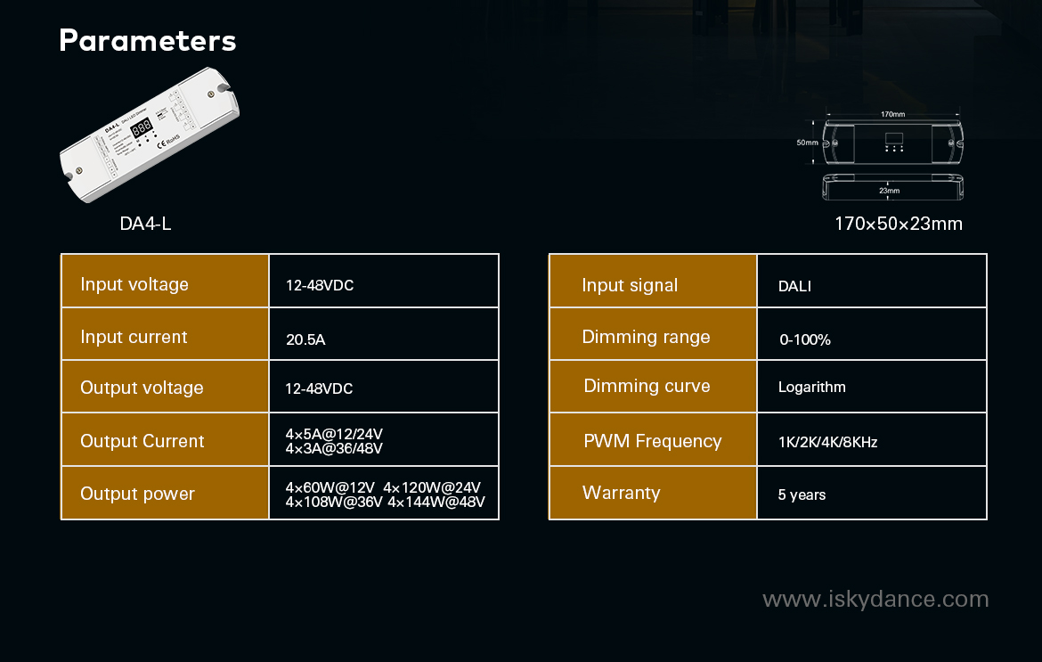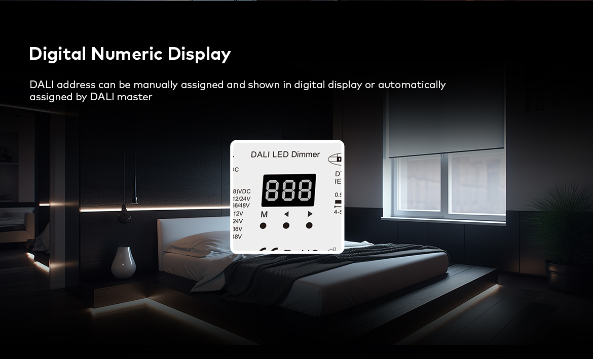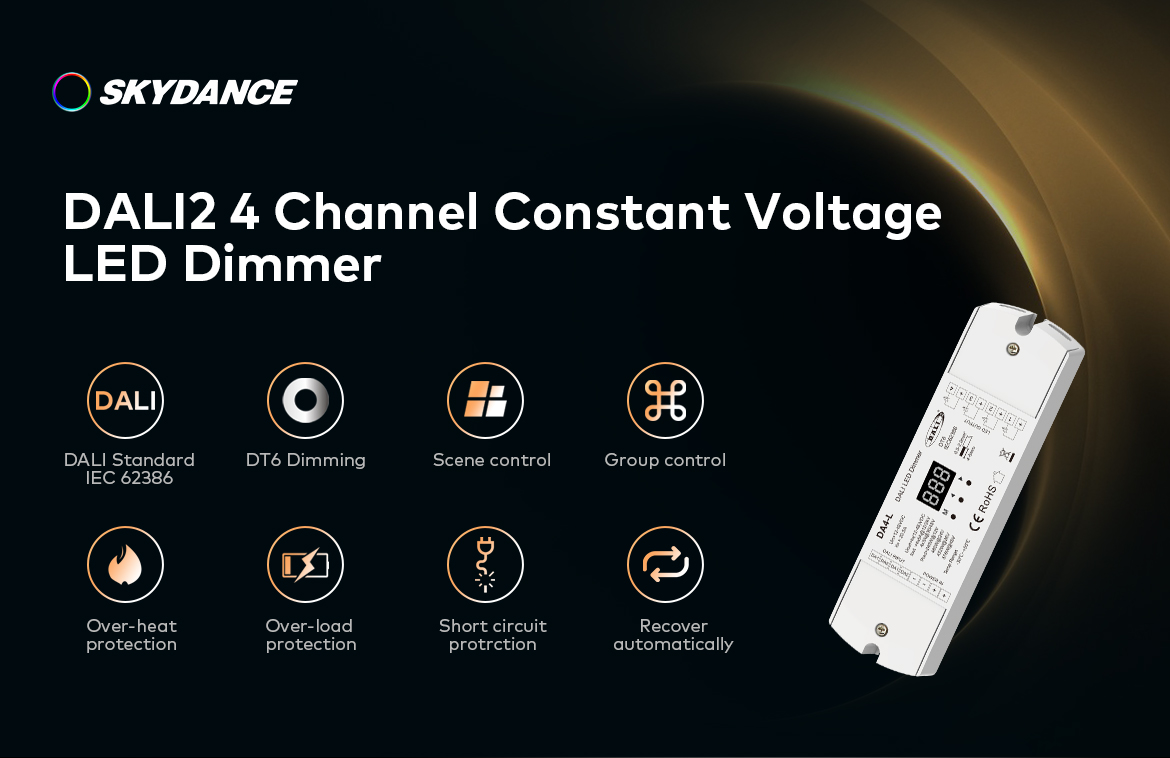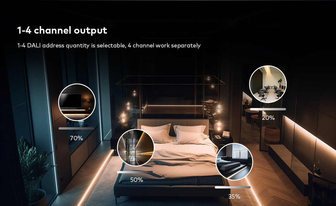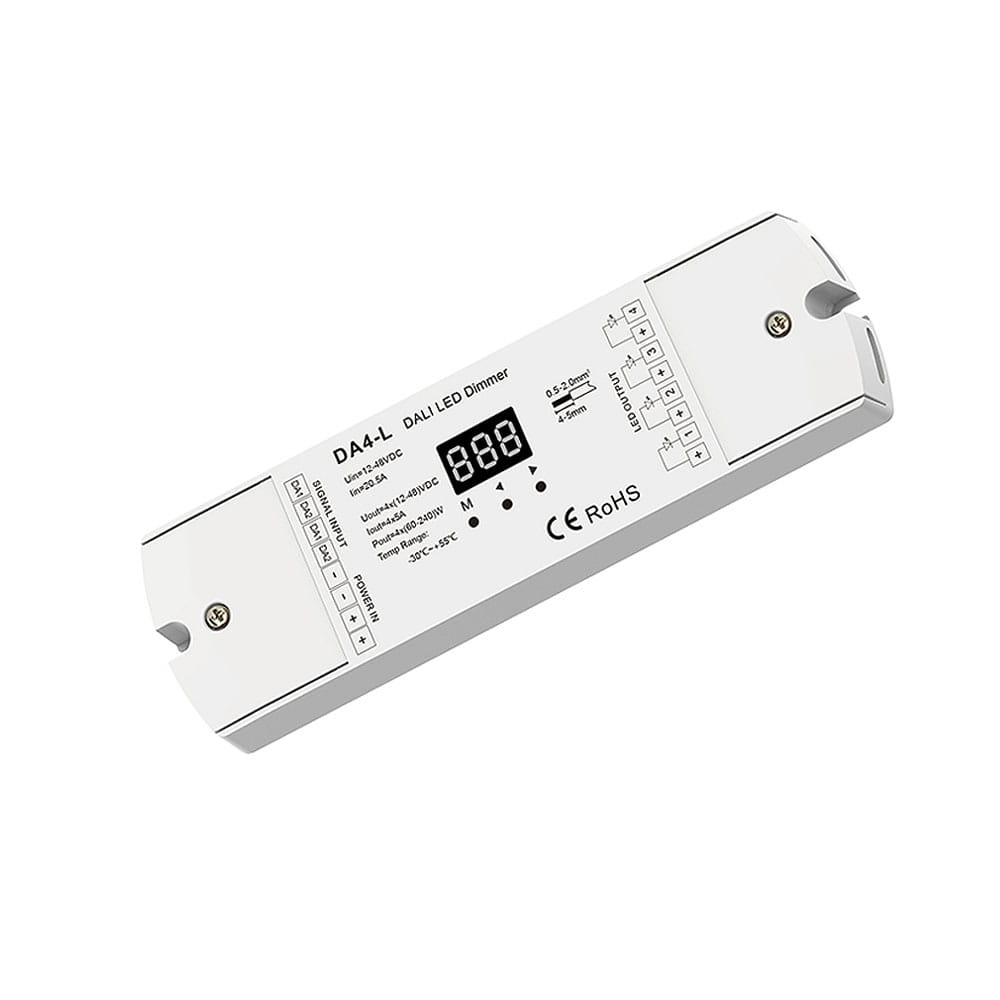 Este un dispozitiv de recepție utilizat pentru a obține controlul asupra iluminării LED monocromatice cu un curent maxim de ieșire de 20A (de exemplu, bandă LED monocromă). Receptorul DA4-L oferă acces la patru ieșiri, la care iluminarea LED conectată poate fi redusă și luminată după cum se dorește folosind sistemul de control DALI. Forma de bază de comunicare a receptorului DA4-L este o conexiune prin cablu la magistrala principală bazată pe rețeaua DALI. Are un afișaj LCD încorporat care arată adresa curentă a dispozitivului. Funcționează cu protocoale de comunicare standard - IEC 62386-102, IEC 62386-207.