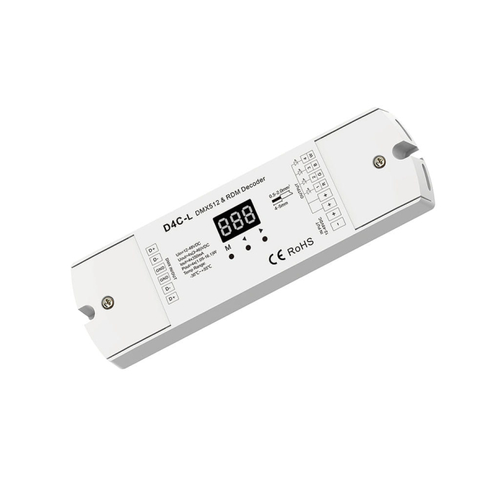 Receptor LED curent DMX512 - 4 canale - 12-48V DC 4x 350-1200MA 3-46V - Decodor DMX - D4C-L (350-1200MA), este un dispozitiv receptor cu patru canale încorporate pentru care putem specifica adrese digitale individuale și putem obține acces la control, de exemplu iluminare LED multicoloră bazată pe o sursă de lumină curentă. Controlul în cazul set-top box-urilor bazate pe DMX este definit ca o schimbare a luminozității, a culorii RGB sau a temperaturii de culoare CCT, deoarece fiecărei ieșiri i se poate atribui o caracteristică la care se va face accesul folosind adresa sa determinată anterior. Obținerea controlului asupra set-top box-ului este posibilă prin primirea unui semnal digital DMX512, care este decodat și convertit într-un semnal PWM, permițându-vă să conectați, de exemplu, LED-uri colorate cu un curent de ieșire de 1200mA. Receptorul DMX512 D4C-L (350-1200MA) vă permite să încărcați până la patru ieșiri cu un curent de 350mA până la 1200mA cu o tensiune de ieșire în intervalul 3-45VDC. Datorită utilizării protocolului RDM, este posibil să se determine adresa set-top box-ului folosind un transmițător DMX512 (de exemplu, consolă) sau de la nivelul set-top box-ului propriu-zis folosind afișajul LCD disponibil.