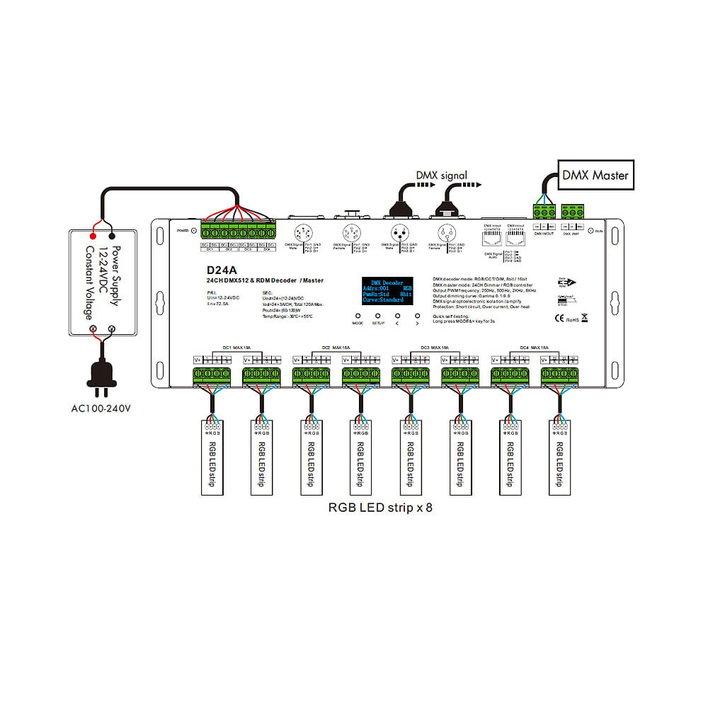 LED DMX512 Driver - 24 Channel - 12-24V DC 24x5A - OLED - Decoder/Master DMX - D24A, este un dispozitiv sub forma unui driver LED cu douăzeci și patru de canale pentru care putem specifica adrese digitale individuale și putem obține acces la control, de exemplu, iluminare LED RGB multicoloră. Controlul în cazul set-top box-urilor bazate pe DMX este definit ca o schimbare a luminozității, a culorii RGB sau a temperaturii de culoare CCT, deoarece fiecărei ieșiri i se poate atribui o caracteristică la care se va face accesul folosind adresa sa predeterminată. Obținerea controlului asupra set-top box-ului este posibilă prin recepționarea unui semnal digital DMX512, care este decodat și convertit într-un semnal PWM, permițându-vă să conectați, de exemplu, o bandă LED RGB + CCT. Driverul LED DMX512 D24A permite, de asemenea, funcțiile de atribuire a unei astfel de adrese de la nivelul unui afișaj OLED dinamic, funcționând apoi ca un emițător DMX. Controlerul DMX512 D24A vă permite să încărcați până la douăzeci și patru de ieșiri cu un curent de 5A la o tensiune nominală de 12-24VDC. Datorită utilizării protocolului RDM, este posibil să se determine adresa set-top box-ului folosind un transmițător DMX512 (de exemplu, consolă) sau de la nivelul set-top box-ului propriu-zis folosind afișajul LCD disponibil. În plus, receptorul are intrări universale implementate prin porturile RJ45, XLR3 și XLR5.