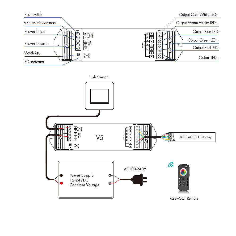 Acesta este un dispozitiv de recepție utilizat pentru a obține controlul asupra iluminării LED multicolore cu temperatură de culoare variabilă (de exemplu, bandă LED RGB + CCT) Receptorul V5 permite accesul la cinci ieșiri, la care iluminarea LED conectată poate fi reglată/luminată liber sau controlată în paleta de culori RGB folosind un semnal PWM, în plus, putem obține control asupra schimbării temperaturii de culoare în intervalul 2700-6500K. Forma de bază de comunicare a receptorului V5 este o cale radio fără fir, care este conectată la o telecomandă pentru LED sau la un panou de perete.